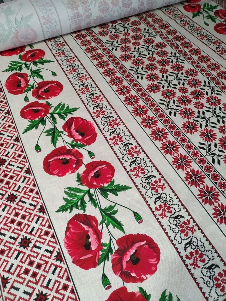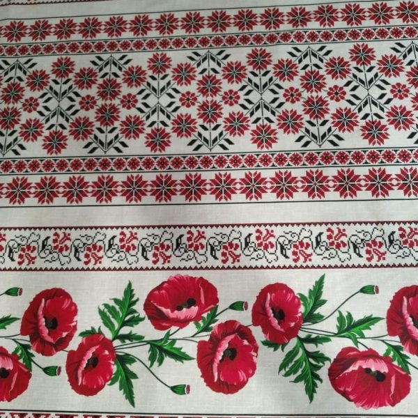 Узор расположен с 2ух сторон ткани, по каймам (слева и справа). И идет бесконечно в длину рулона. Размер узора с одной стороны 49 см + серединка 52 см + размер узора с другой стороны 49 см . Итого ширина ткани 150см