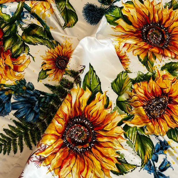 Средней плотности. Струится и немного держит форму. Не просвечивает, с красивым мерцанием. Материал упругий, гладкий, с атласным блеском. Хорошо драпируется. Изнаночная сторона – матовая