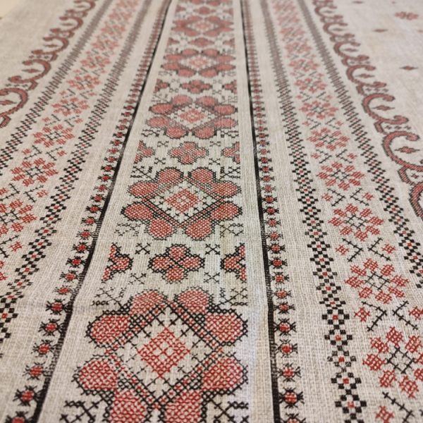 Узор расположен с 2ух сторон ткани, по каймам (слева и справа). И идет бесконечно в длину рулона. Размер узора с одной стороны 41см + серединка 68см + размер узора с другой стороны 41см . Итого ширина ткани 150см
